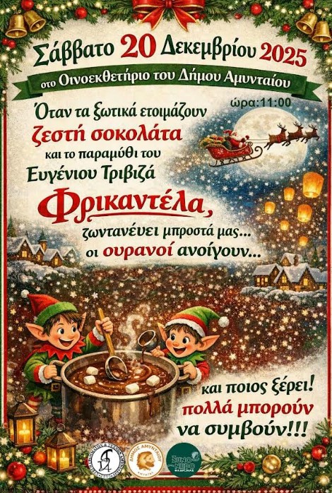 Το Σάββατο 20 Δεκεμβρίου 2025, στις 11:00 π.μ., το Οινοεκθετήριο του Δήμου Αμυνταίου μεταμορφώνεται σε έναν ζεστό, χριστουγεννιάτικο κόσμο φαντασίας και σας προσκαλεί σε μια ξεχωριστή εκδήλωση για μικρούς και μεγάλους.