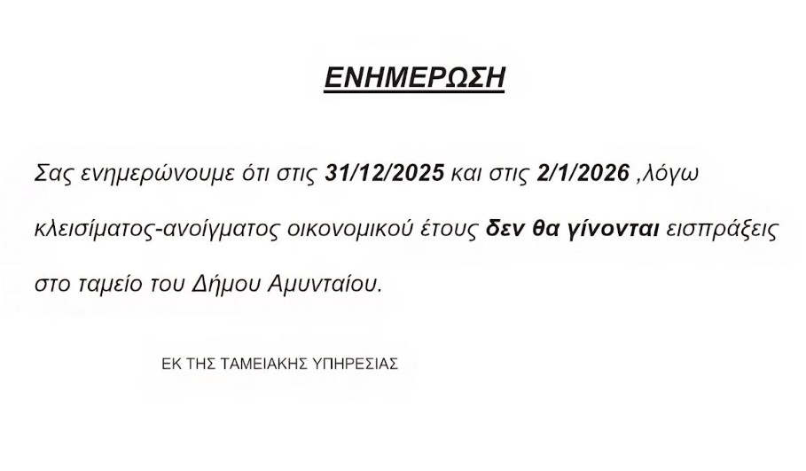 Κλειστές για το κοινό οι Δημοτικές Υπηρεσίες του Δήμου Αμυνταίου, την Τρίτη 16 Δεκεμβρίου 2025