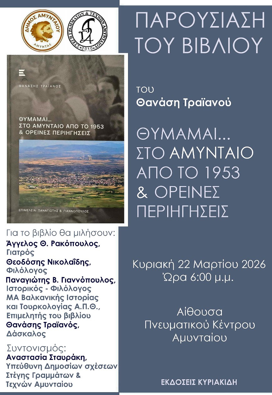 Ο Δήμος Αμυνταίου και η Στέγη Γραμμάτων & Τεχνών Αμυνταίου σας προσκαλούν στην παρουσίαση του βιβλίου του Θανάση Τραϊανού: